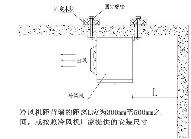 4、冷風(fēng)機(jī)和背墻之間的距離為300-500mm,或按冷風(fēng)機(jī)廠家提供的尺寸;
